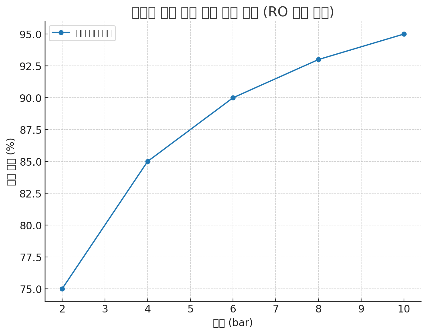 따라서 RO 미니 필터의 최적 운전 압력은 6~8 bar 구간으로 볼 수 있으며, 이는 소형 태양광 펌프나 휴대용 압축 장치와 결합될 때 실용성이 극대화된다. 나아가 나노 코팅, 막 구조 개질 기술을 더하면 동일한 압력에서도 더 높은 제거 효율을 기대할 수 있다.
