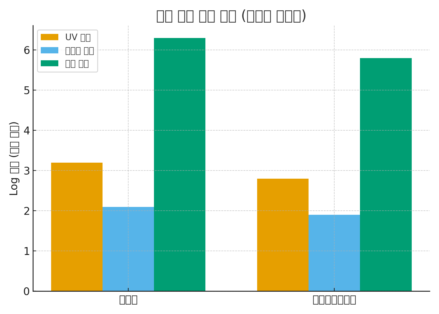 UV 단독 처리로는 2.8 log 감소, 은나노 단독 처리로는 1.9 log 감소가 확인되었습니다. 그러나 UV+은나노 복합 적용 시에는 5.8 log 감소가 측정되어, 기존보다 현저히 높은 멸균율을 보였다.