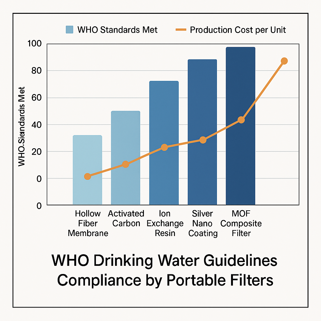 이 그래프는 다양한 휴대용 필터 재질이 WHO(World Health Organization) 권장 음용수 기준을 어느 정도 충족하는지를 시각적으로 보여준다. 그래프의 주요 축은 중금속 제거율, 미생물 억제 효과, TDS(총 용존 고형물) 저감 효율, 장기 사용 후 성능 유지율로 구성되어 있으며, 각 필터의 특성과 한계가 뚜렷하게 대비된다.