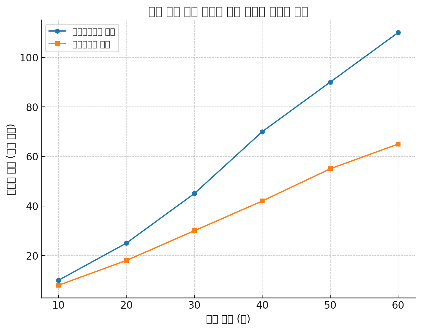 - 파란 곡선(비인체공학적 설계)은 사용 시간이 늘어남에 따라 피로도가 기하급수적으로 증가하여 60분 사용 시 피로 지수가 110에 도달합니다. 이는 손목, 전완부 근육, 어깨 관절에 지속적인 하중이 집중되는 구조적 문제를 반영합니다.